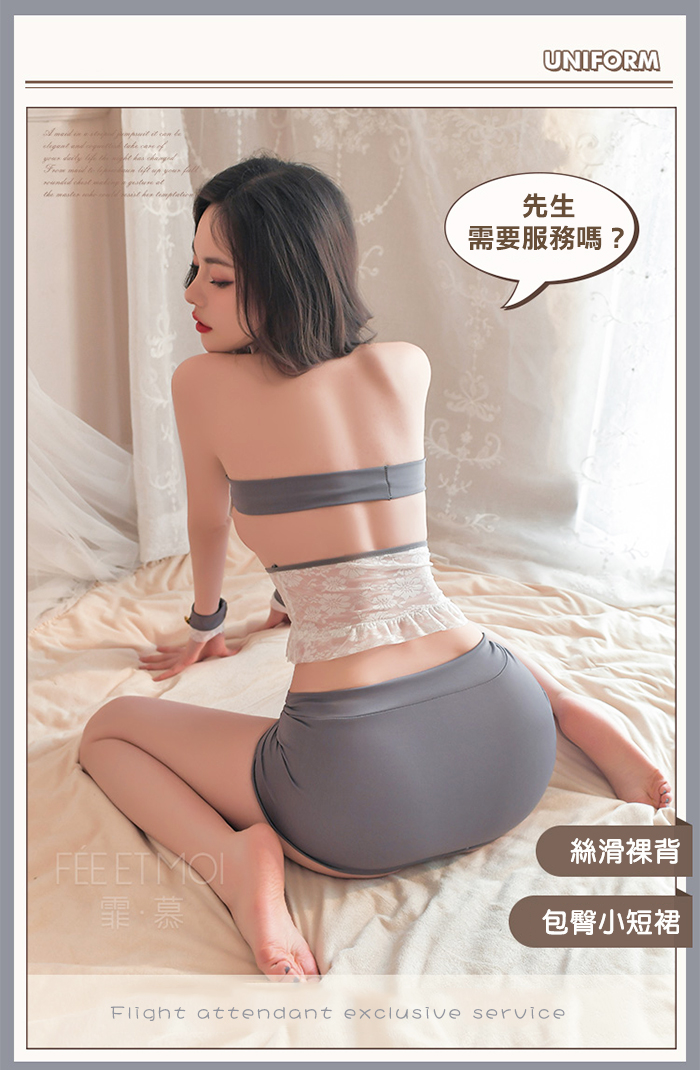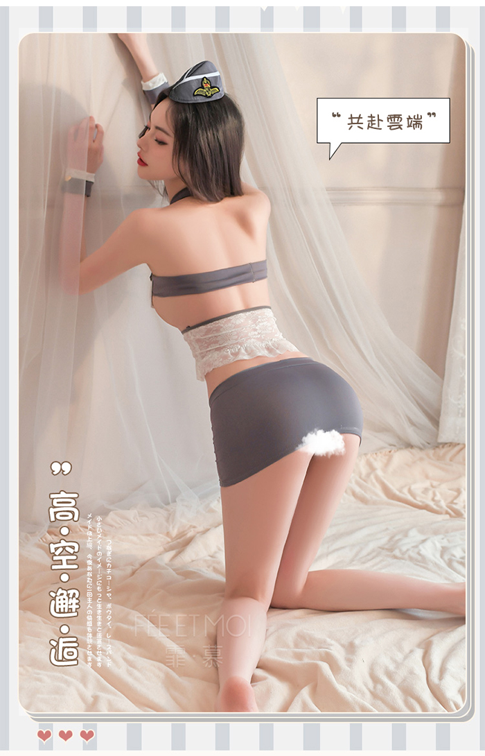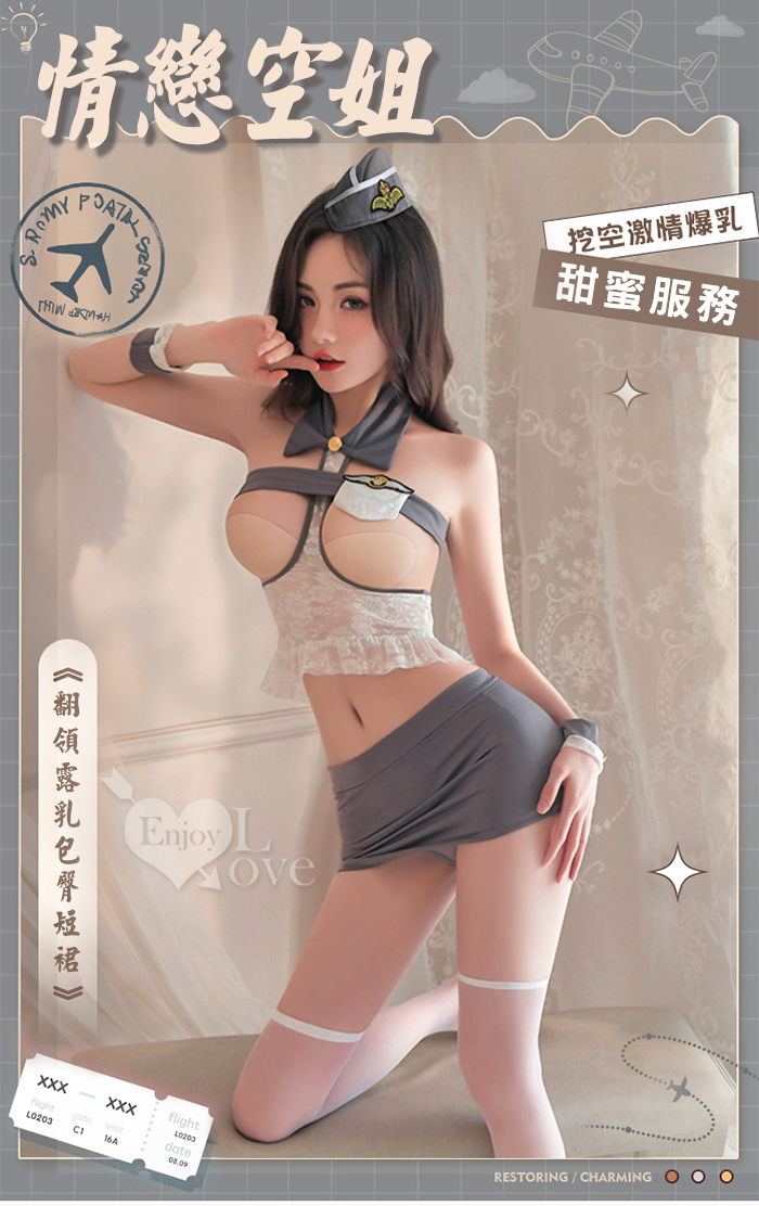 空姐角色扮演服!金屬釦翻領雪白露乳包臀短裙七件式套裝