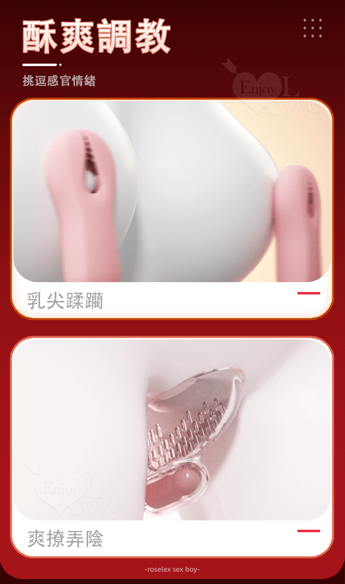 ►您現在的位置:首頁>ROSELEX ‧ \\\" 乳X陰\\\" 此好玩 進階充電款 激震夾乳+爽撩弄陰按摩器﹝20頻調控/軟刷觸鬚刺激﹞