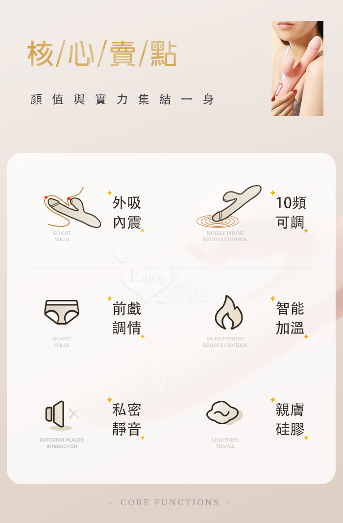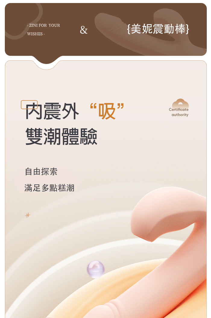 ►您現在的位置:首頁>ZINI ‧ Minnie 愛吸吸の美妮 5段吸吮10頻強震 G點按摩棒﹝內外刺激/親膚任彎/智能加溫/USB充電﹞