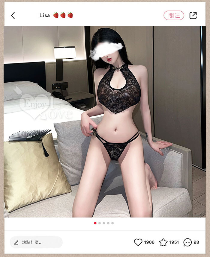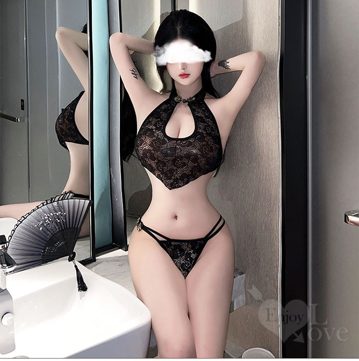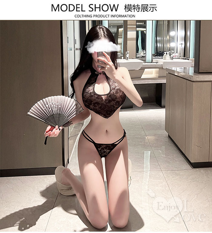 情趣肚兜!盤釦立領水滴鏤空蕾絲透視含開襠褲兩件組