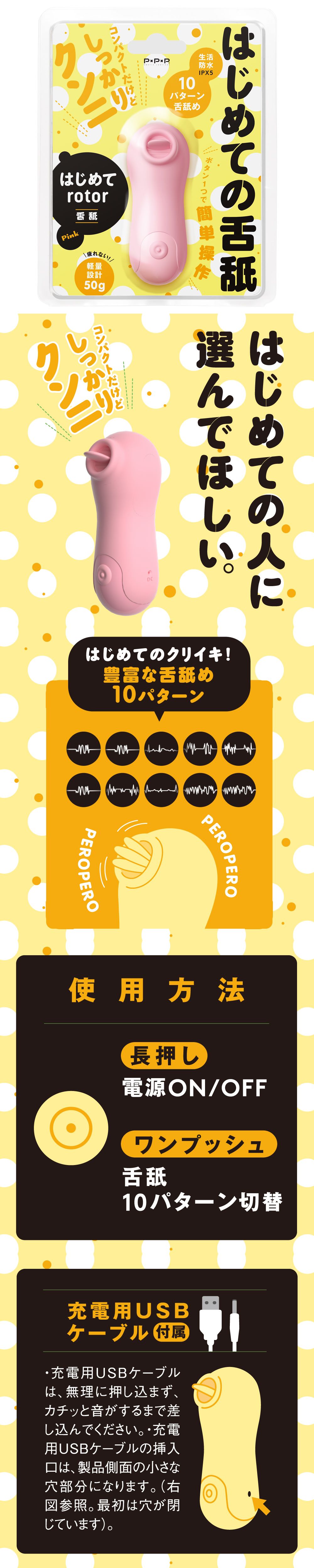 「はじめて」の人に選んでほしい。コンパクトボディでもしっかりイケる、舌舐め10パターン。手が疲れない軽量設計50g。ボタン一つで簡単操作。USB充電ケーブル付属。生活防水IPX5。検査番号:2302292