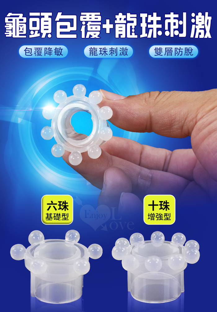 ※ 進口超級柔軟無毒矽膠製作,戴在龜頭龜冠凹處,可大大減低龜頭敏感度,突出龍珠又可增加女性快感的功能。