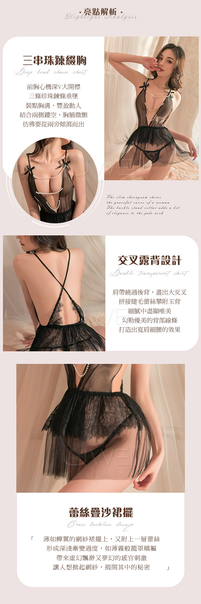 深V開襟,珍珠鍊條裝飾渾圓的酥胸,