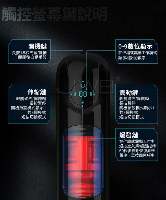 ■尺寸:大小詳如圖片標示 ■材質:ABS+TPE ■供電:USB充電 ■特點:9頻伸縮、 9頻震動