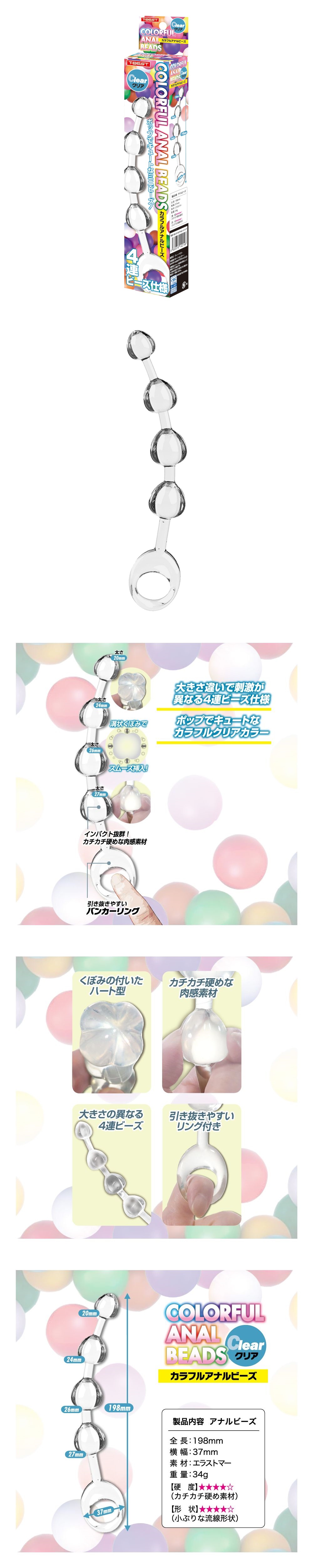 ポップでキュートなミニサイズのア●ルビーズが新登場!かわいいハート形状が、大きさ順に4つ連なるア●ルビーズです。先端から20ミリ、24ミリ、26ミリ、27ミリと奥に行くほど太くなるので、快感のステップを楽しめます。さらに、本体形状として縦縞くぼみがあり、空気や液体の通り道となり挿入心地をサポート。最奥部は引っ張りやすい輪っか付き。ビギナーの方にもぴったりな4連モデルで、スケルトンでカラフルなボディカラーが抵抗感を低減させます。本体素材には、カチカチ硬めなエラストマー素材で、インパクトのある肉感を再現しました。この硬さが、強い存在感を放ちます。あなたを夢中にさせる快感素材と、ビギナーにもオススメできるベーシックな型状で、狙いを外さない鉄板のア●ルビーズです。