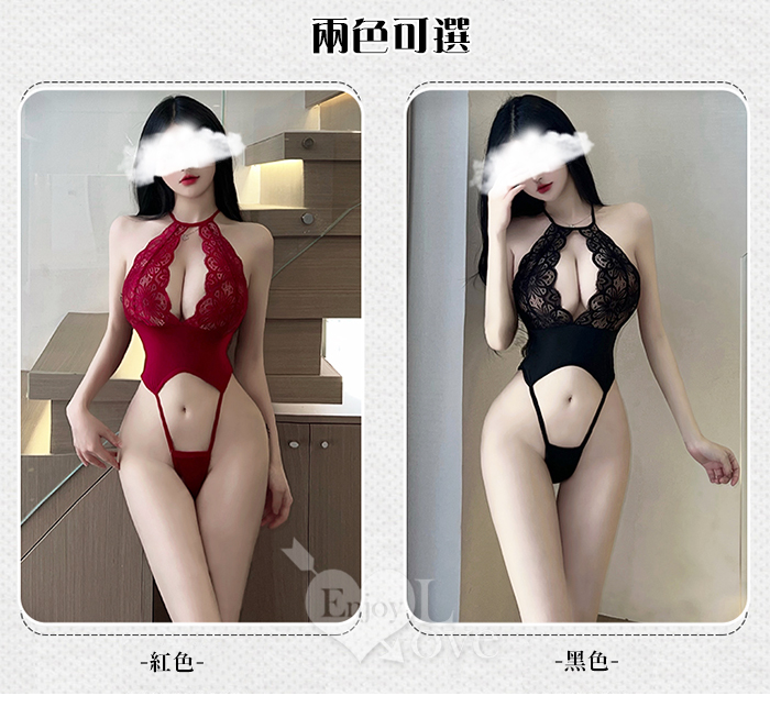 狂野連身衣!緹花蕾絲包覆美胸露溝後交叉裸背開襠連身裝﹝紅﹞
