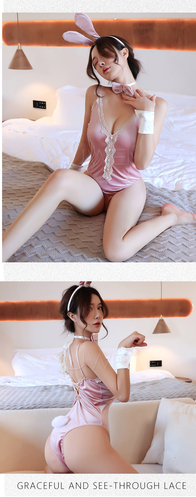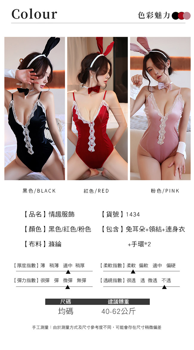 ◇◆蜜桃魅影.性感蕾絲深V露背側高叉兔女郎連身衣4件組(黑色)◆◇