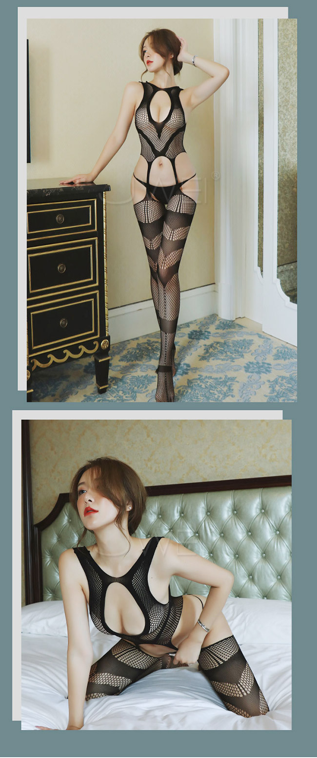 ◇◆靜待愛戀.性感胸前圓孔透視鏤空美背吊襪連身貓裝◆◇