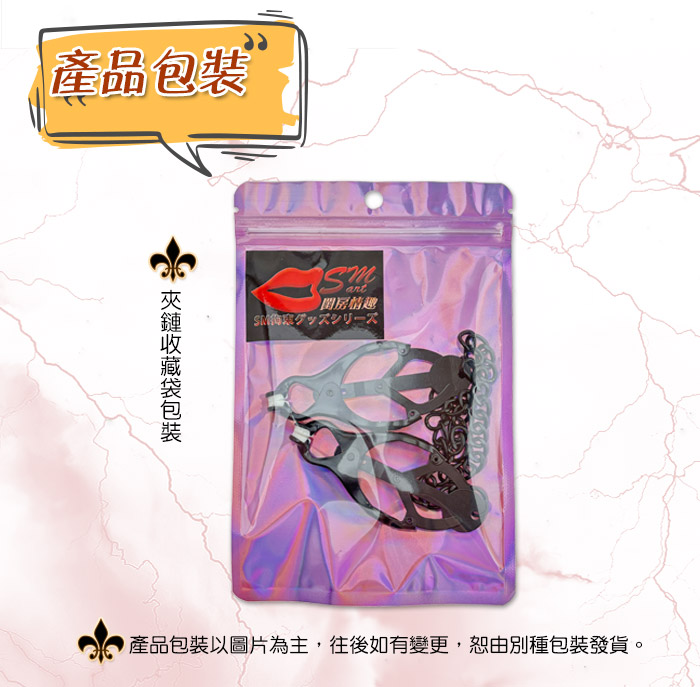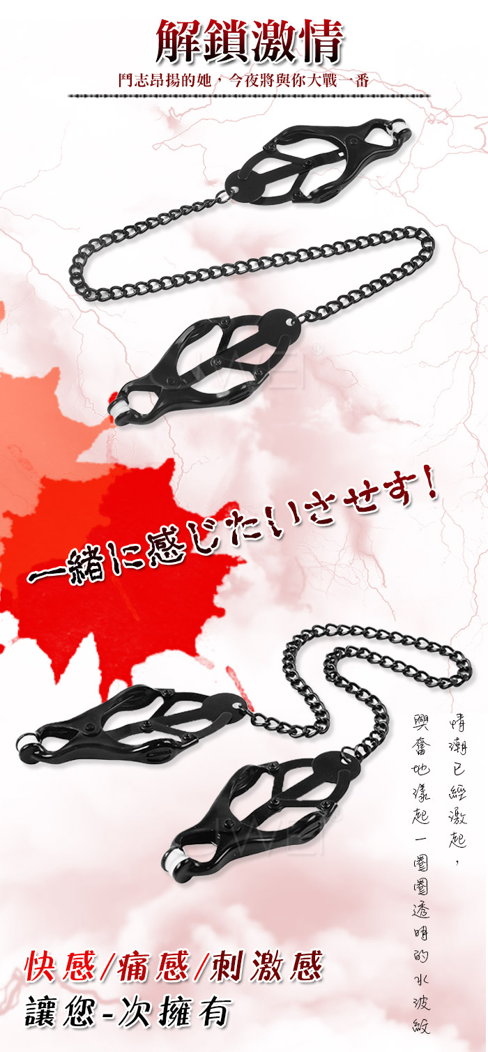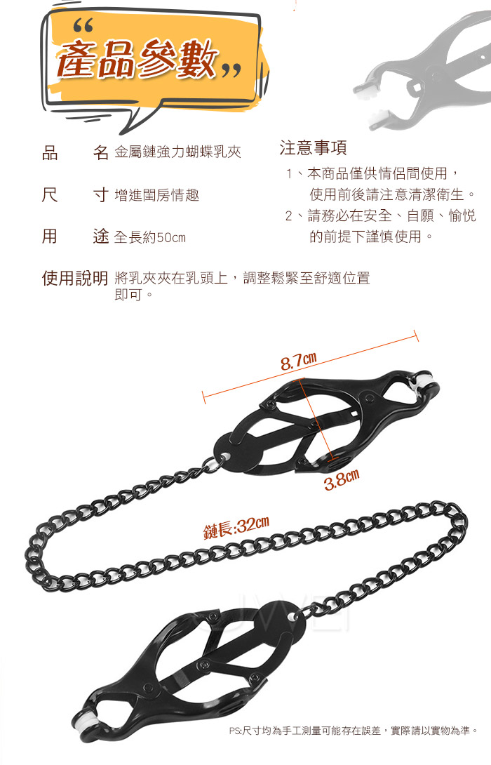 金屬鏈強力蝴蝶乳夾,外觀別致、充滿了誘惑力、激發慾望;乳夾上有 柔軟矽膠墊保護,不會傷害皮膚。金屬材質的鏈條,使用時間長久,牢 固、光滑新穎。