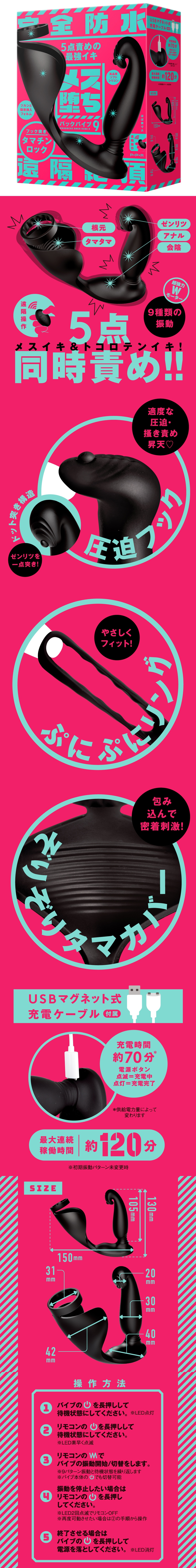 《完全防水 遠隔絶頂 メス堕ちバックバイブ9 フック突きタマチンロック》