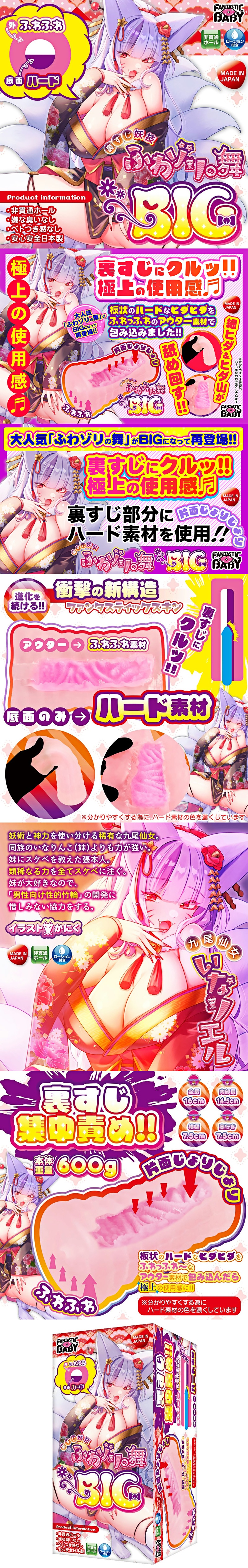 あの大ヒットホール「ふわゾリの舞」がBIGになって新登場!!もっと肉厚を…。もっと包み込まれたい…。もっとすじをゾリゾリされたい…。人の欲望は果てしない。そんな想いに狐仙女が答えを出した。カ〇攻め妖技(ようぎ)という何やら怪しげな技を用いて作られたこのオナホールはやっぱりスゴイ!!これまでの妖技を超える新技が使われており、それがなんと…オナホールの一部だけを固くする技なのである!!ふんわ~りとしたトロトロ素材で荒ぶる男たち全てを一瞬で包み込みほぐしてしまう優しさに溢れている…と油断させておいて、裏〇じに当たる部分に仕込まれたハード素材に快感が集中!!並大抵の男では一瞬で昇天しまうギミックが施されているのである。狐仙女が生み出した構造の真の恐ろしさを世間が知った今、彼女の追撃はまだまだまだ終わりそうになかった。「もっと愉快な鳴き声を聴かせてほしいわね!」