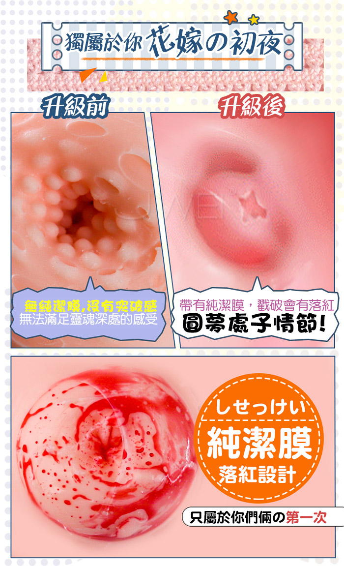 突破屬於自己的靈魂伴侶,愛的初體驗,獨屬於你花嫁の初夜,帶有純潔 膜,戳破會有落紅,圓夢處子情節!圓潤雙峰,Q彈飽滿 ;成熟蜜桃臀, 蕩漾臀波 ;性感の處子地等你突破;純潔之證蜜壺落紅,我把第一次交 給你了哦~