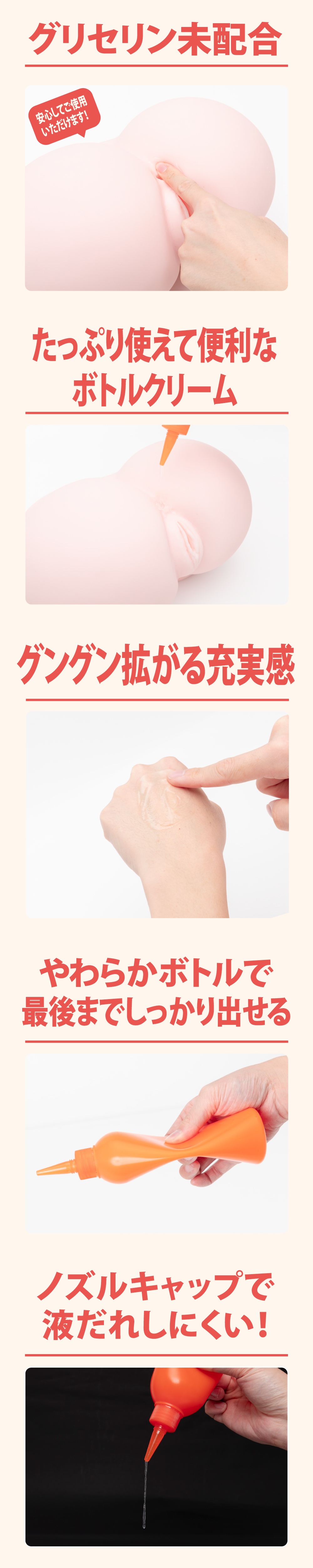 【グングン拡がる充実感!】快適なアナニーライフを楽しんでいただける拡張クリームにボトルタイプの登場です。充填されている拡張クリームは低刺激なものとなっており敏感な部分に負担をかけません。プレイ前に使用していただくと適度にほぐれスムーズなプレイを楽しんでいただけます。容器が柔らかく使いたい量をしっかり出せます!注ぎやすく液だれしにくいノズルキャップでたっぷり使えて便利な300mlのボトルクリームです!検査番号:2304467