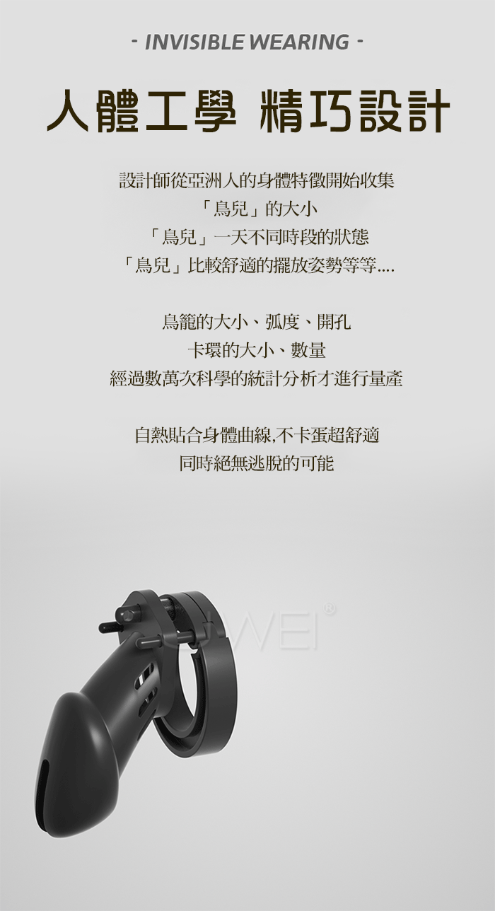 人本工學精巧設計 設計師從亞洲人的身體特徵開始收集 「鳥兒」的大小、「鳥兒」一天不同時段的狀態、「鳥兒」比較舒適的擺放姿勢等等. 鳥籠的大小、弧度、開孔、卡環的大小、數量,經過數萬次科學的統計分析才進行量產 貼合身體曲線,不卡蛋超舒適,同時絕無逃脫的可能,多孔透氣,雙側邊六開孔設計 讓小鳥暢快呼吸不沈悶,前端開口設計,大開口前端尿路口設計, 防灑濺,易清理。