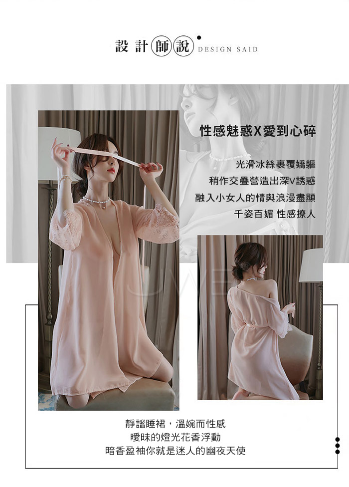 | 曖昧風情.光滑冰絲性感透膚蕾絲衣袖宮廷綁帶睡袍(黑色)