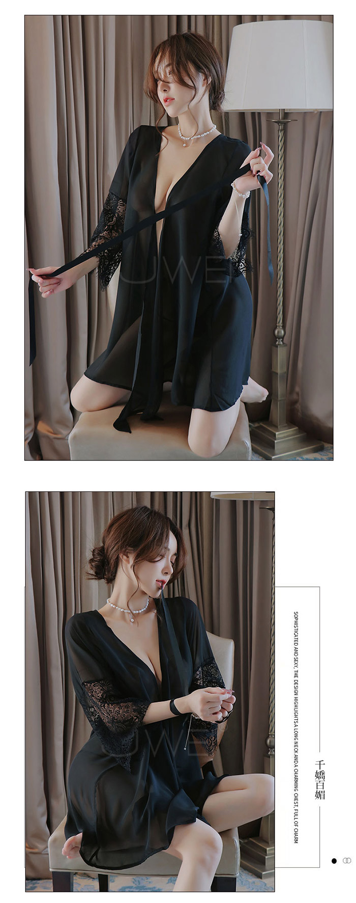 ◇◆曖昧風情.光滑冰絲性感透膚蕾絲衣袖宮廷綁帶睡袍(黑色)◆◇