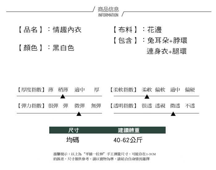 ■內容物:兔耳朵x1、脖環x1、連身衣x1、腿環x1