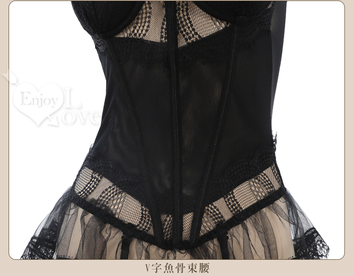 ►您現在的位置:首頁>情趣馬甲裙!鋼圈聚攏魚骨束腰三檔排釦蕾絲裙五件式套裝