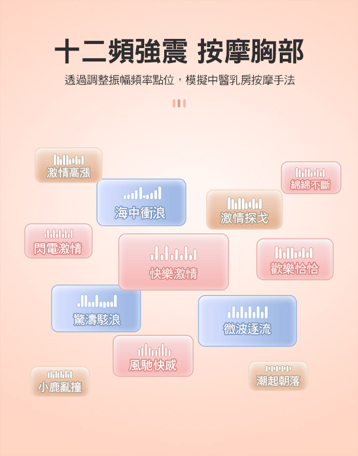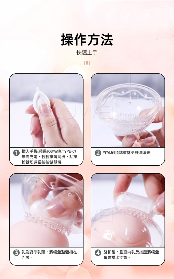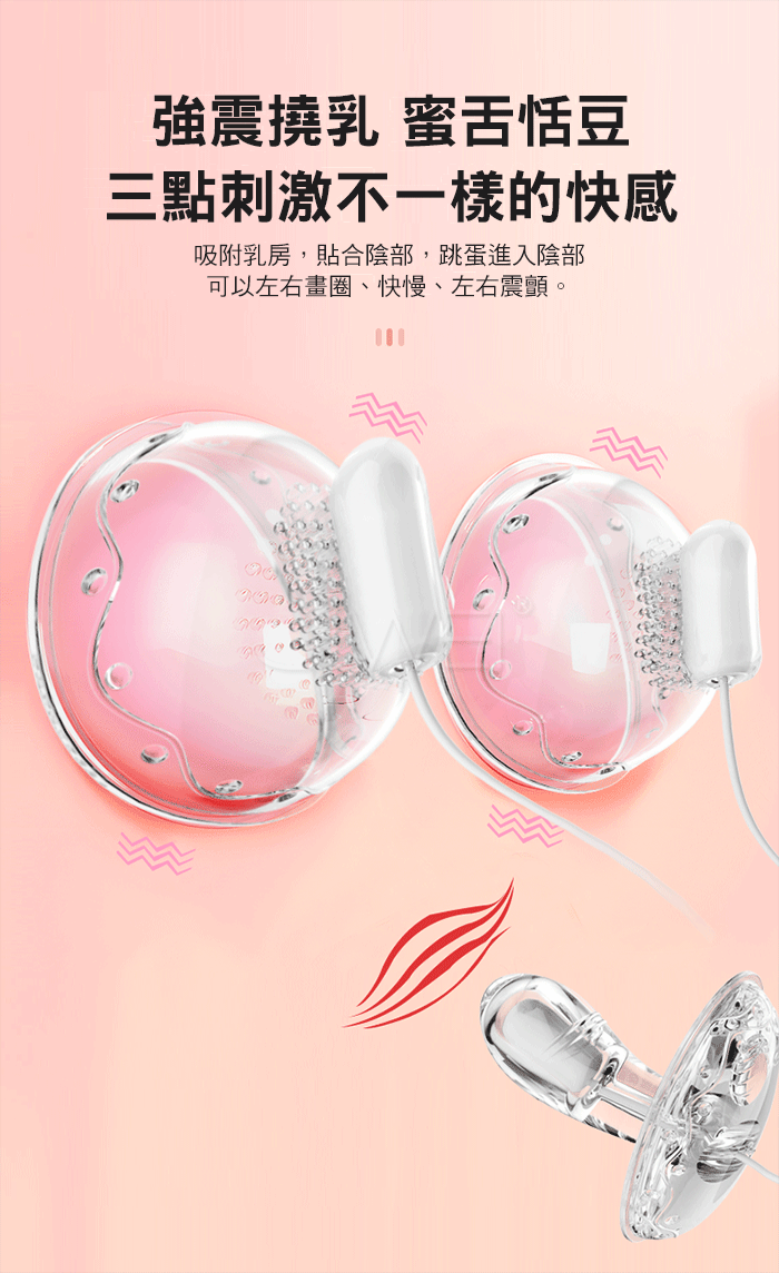強震撓乳,蜜舌恬豆 智能一收一放,呵護女性胸部健康 三點刺激不一樣的快感 吸附乳房,貼合陰部,姚蛋進入陰部 可以左右畫圈、快慢、左右震顫。 5D大顆粒,乳尖強震,酥麻乳暈 強力吸附不掉落,內設柔軟雨刷 刺激每個敏感神經,領略觸電般的感知 盡情享受胸部SPA,真空負壓法-低頻波低脈衝法 ●材質:矽膠+TPE+ABS ●充電方式:手機直連蘋果/安卓 ●尺寸:如圖示
