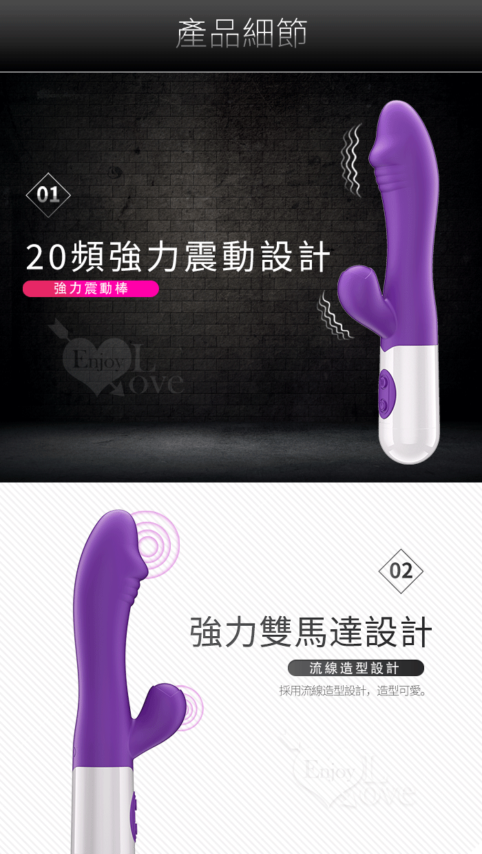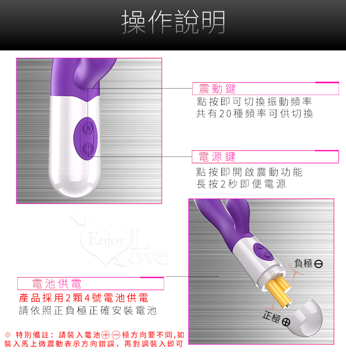 ►您現在的位置:首頁>NEnjoy Love ‧ 強力雙震 內外同享 20頻電動按摩棒~電池款 - 紫