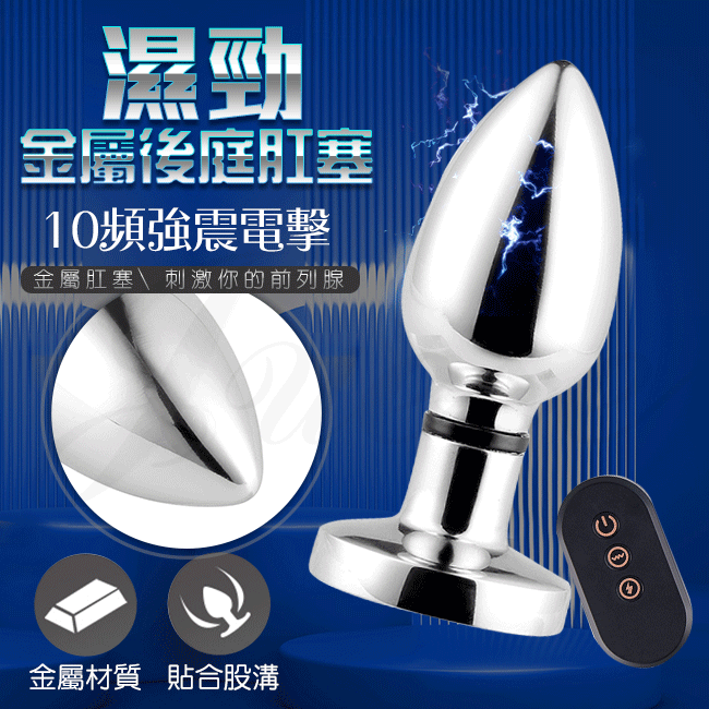 | 濕勁 10段震動+6檔電擊遙控後庭刺激金屬USB充電震動肛塞-小號