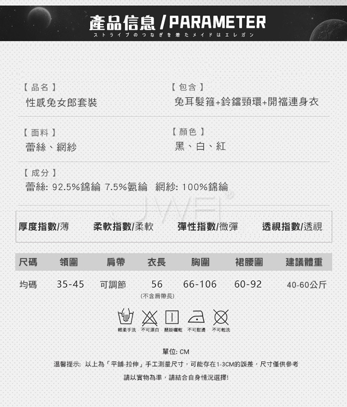 ■內容物:免耳髮箍+鈴鐺頸環+開襠連身衣 ■適穿尺寸:FREESIZE ■彈性:些許 ■未撐開平量尺寸正負誤差1~2cm,1吋=2.54cm ■注意事項:基於保障消費者個人衛生,此貼身衣物恕不接受退換貨。 (如為商品本身暇疵,接受七日內換貨,請勿試穿,謝謝您)