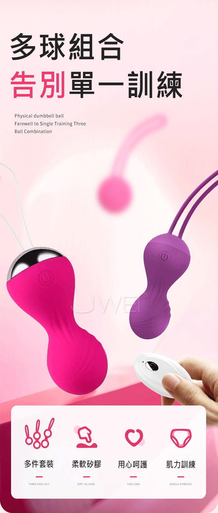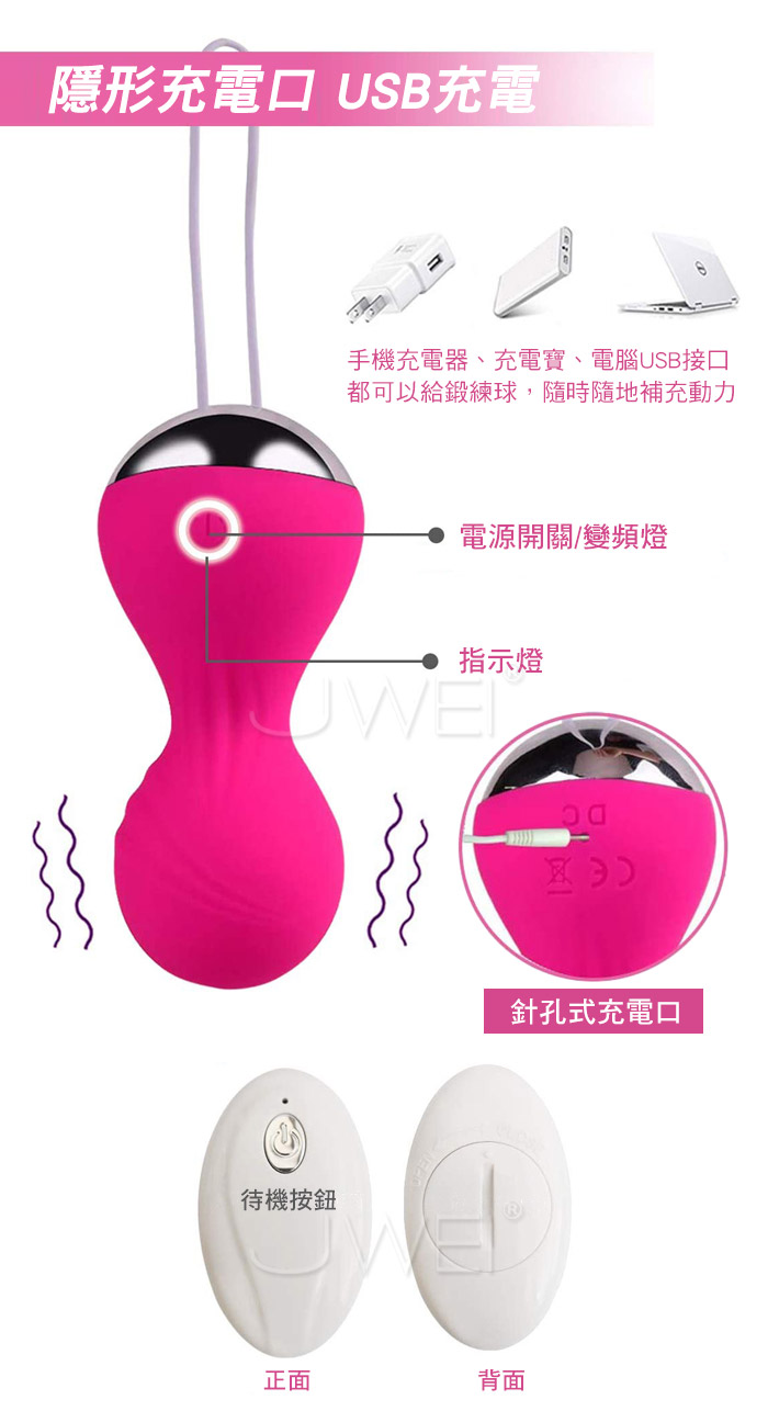 多球組合,告別單一訓練。 盆底肌 受損五大原因 你知道嗎? 改變從這一刻開始 七天給你全新感受! 產品規格 ■產品材質:TPE+ABS ■規格:詳如下圖所示 ■功能:10頻震動、無線遙控 ■供電方式:USB充電