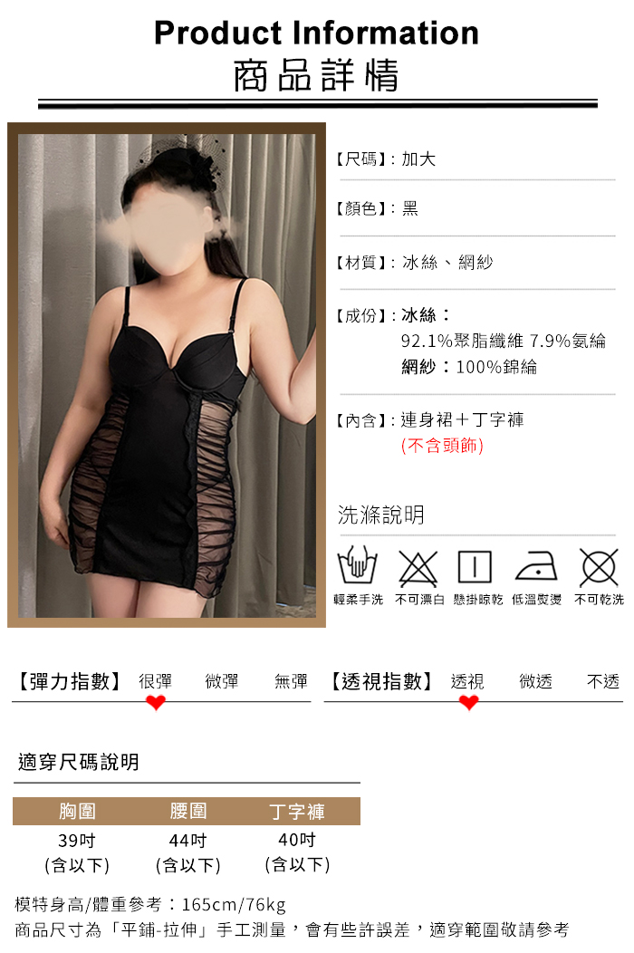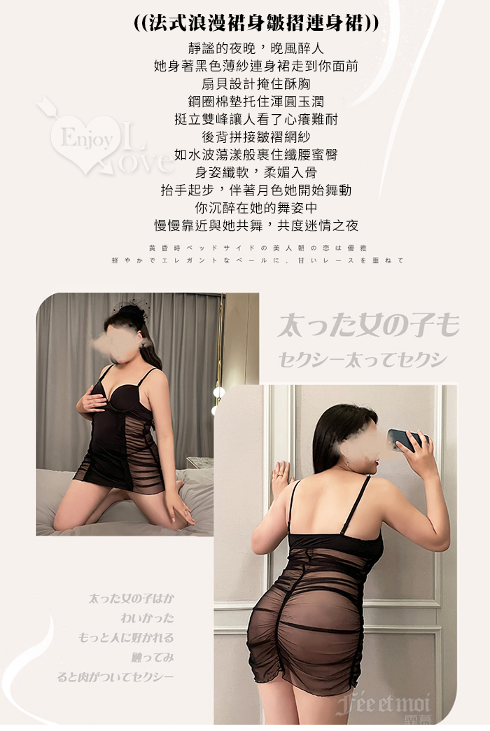 | 【棉花糖女孩】大尺碼情趣睡衣!絲滑吊帶加厚胸墊裙身皺摺設計兩件組