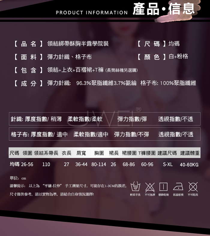 ■內容物:領結+上衣+百褶裙+T褲 ■適穿尺寸:FREESIZE ■彈性:不彈 ■未撐開平量尺寸正負誤差1~2cm,1吋=2.54cm ■注意事項:基於保障消費者個人衛生,此貼身衣物恕不接受退換貨。 (如為商品本身暇疵,接受七日內換貨,請勿試穿,謝謝您)