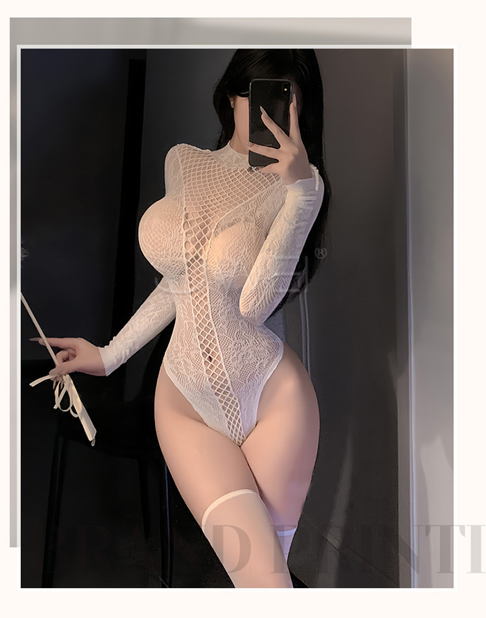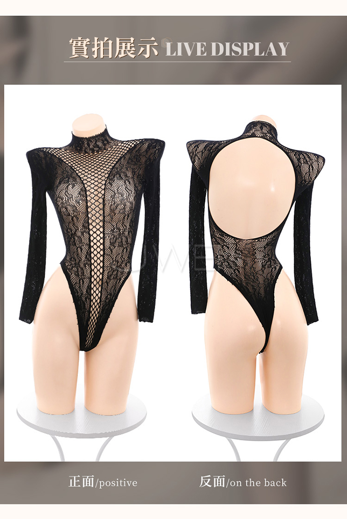 ►您現在的位置:首頁>織心澀澀.風情大挖空網眼提花透膚長袖連體貓裝-黑色【單件網衣+黑長筒絲襪】