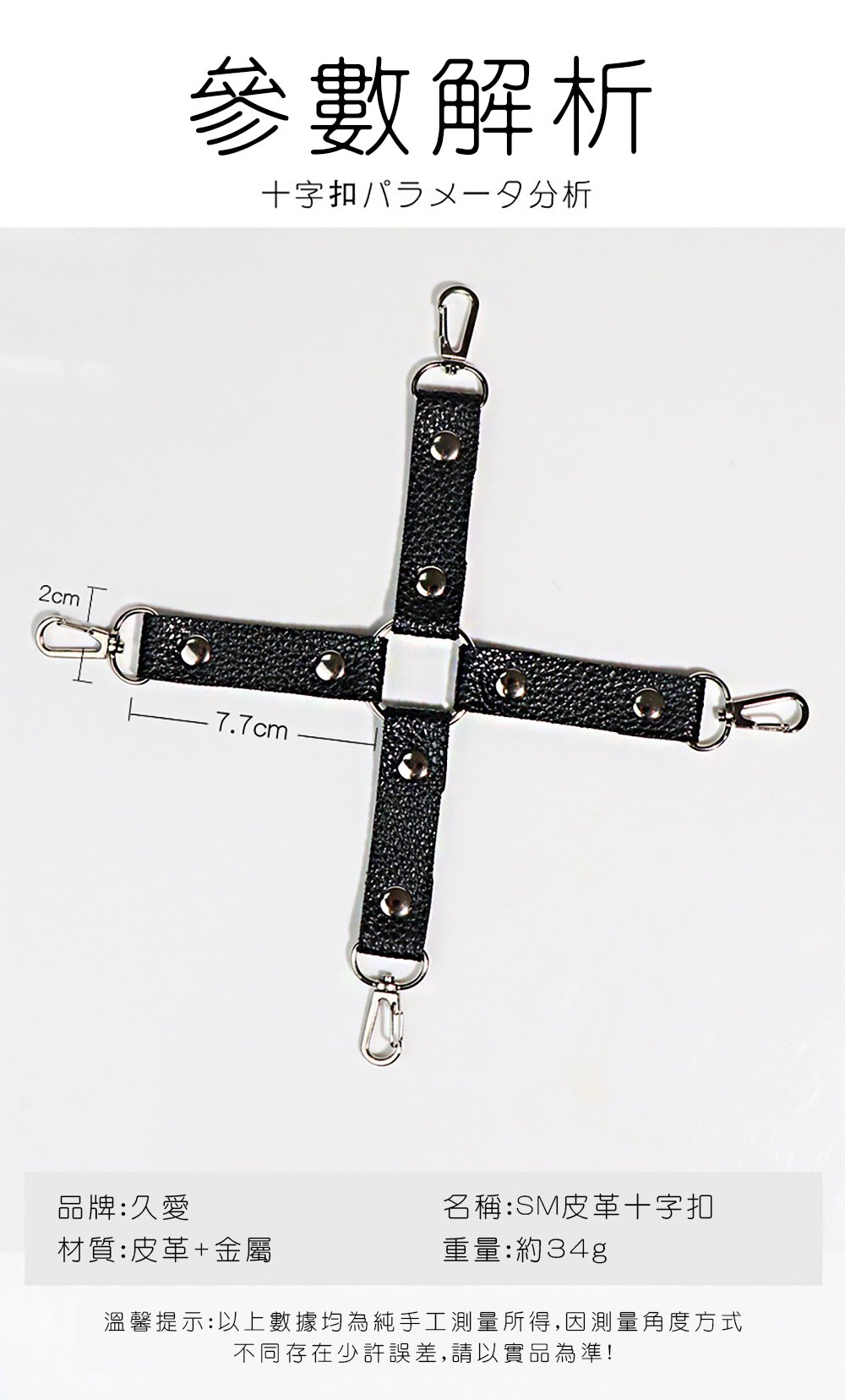 用途:男女情趣之用 材質:皮革+金屬 規格:手動型/十字扣/黑 淨重:約34g 總重:約36g 尺寸:長24x寬24x深0.6cm,單邊帶長(含扣)約11cm 外盒尺寸:13x13x1cm 注意:使用前請確實作好溝通,並注意安全! 無內附其他配件(如:手銬等),如需請另購。 ※情趣用品屬於個人衛生用品,經拆封使用,無法接受退換貨!※ ※每台電腦的解析度皆不同,可能有些微色差,顏色皆以實品為主!※