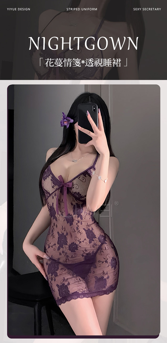 枕邊禁語.純欲花蔓薄紗透視睡裙-紫色【睡裙+T褲】
