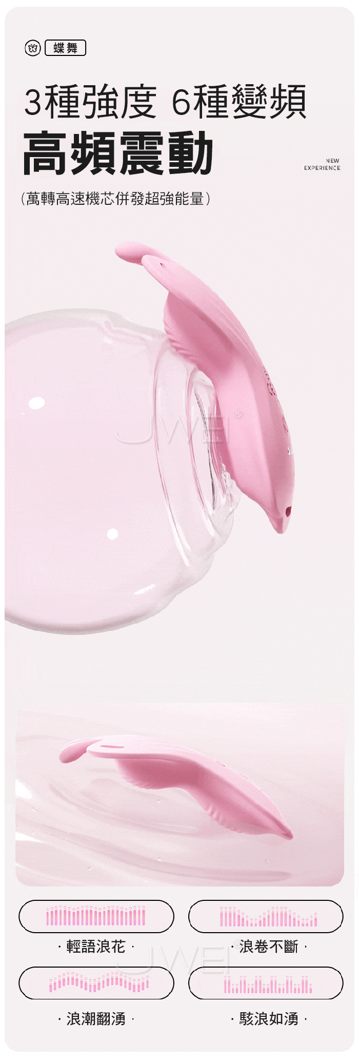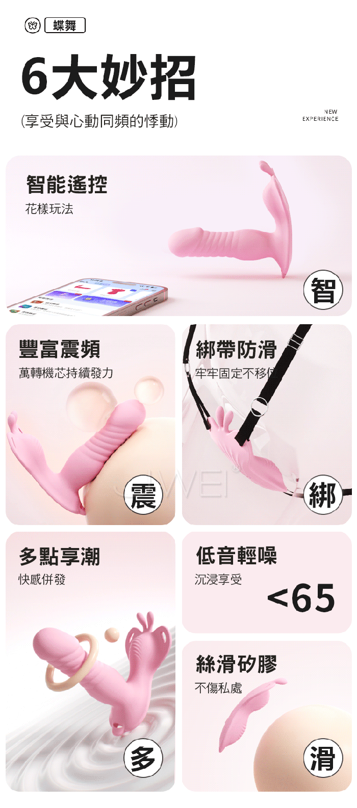 如蝶舞般,貼合肌膚,開啟私密愉悅新體驗 綁帶設計,物理固定,緊緊的抱著不脫落,集中刺激!! 手机遥控智能APP,創意玩法不重樣 體驗不一樣的快樂 3種強度6種變頻,高頻震動,萬轉高速機芯併發超強能量 ■尺寸:大小詳如圖片標示 ■材質:矽膠+ABS ■供電:USB充電 ■模式:9頻強震、APP智控