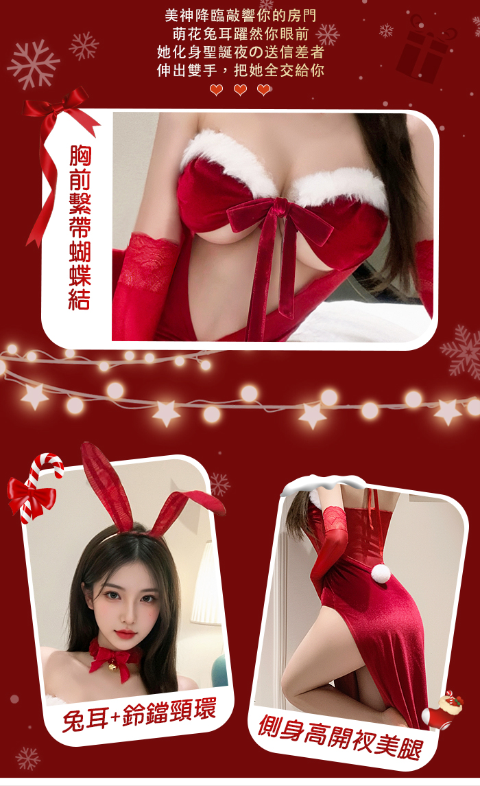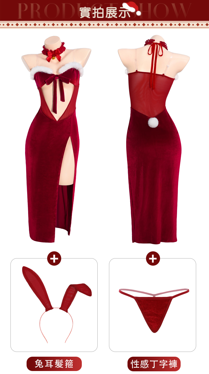 聖誕魅力/新年狂歡派對!兔耳毛絨蝴蝶結中空禮服|側開高衩性感長裙六件式套裝