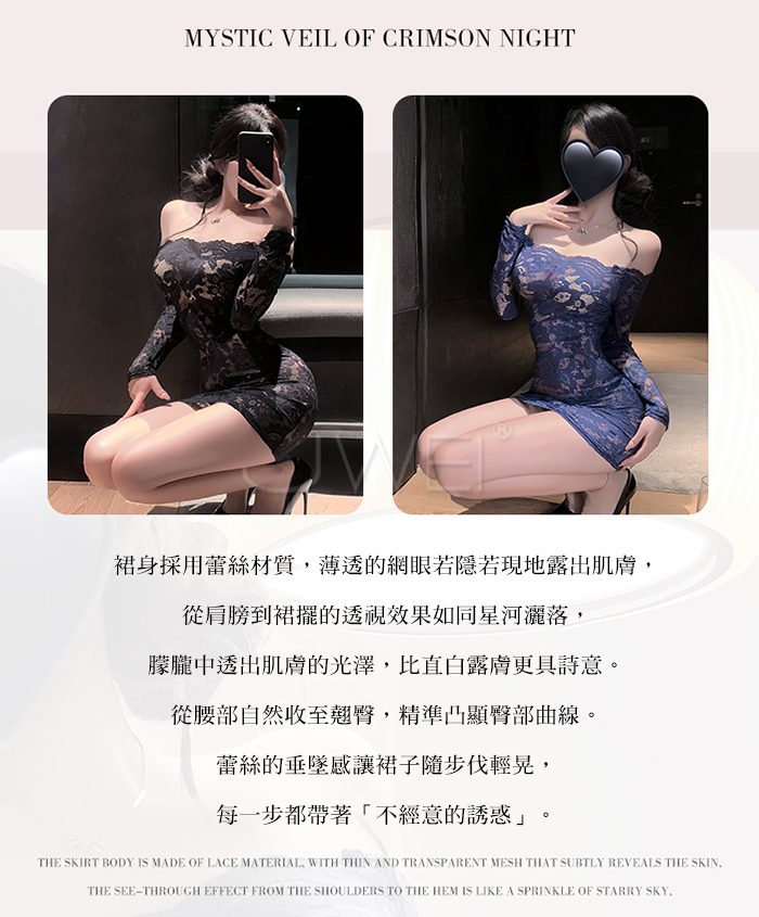 | 花蔓朦朧.蕾絲雕花一字領透視包臀睡裙【連身裙+T褲+隱形肩帶-藍色】