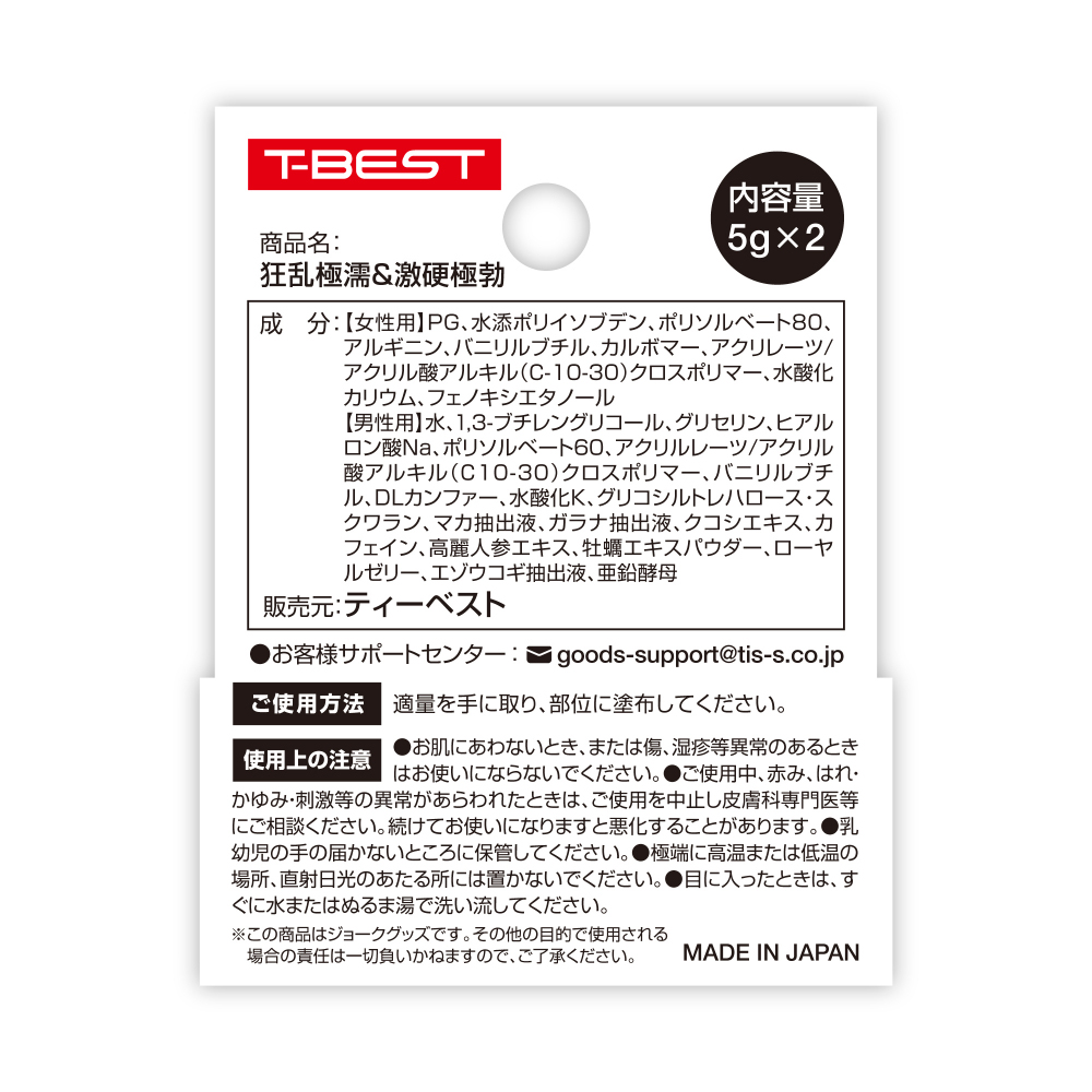 日本 T-BEST 激愛組合女用狂亂極濡+男用激硬極勃軟霜(5gx2)