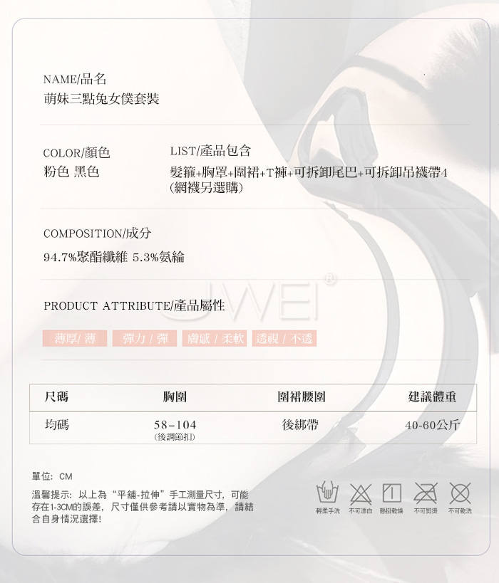 ■內容物:髮箍+胸罩+圍裙+T褲+可拆卸尾巴+可拆卸吊襪帶4 ■適穿尺寸:FREESIZE ■彈性:彈 ■未撐開平量尺寸正負誤差1~2cm,1吋=2.54cm ■注意事項:基於保障消費者個人衛生,此貼身衣物恕不接受退換貨。 (如為商品本身暇疵,接受七日內換貨,請勿試穿,謝謝您)